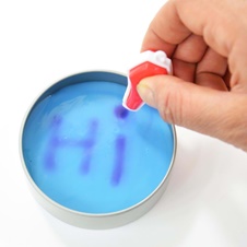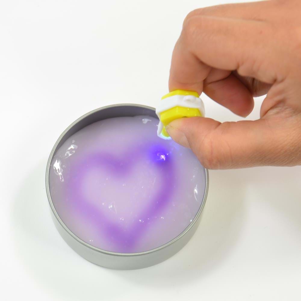 Schreibe geheime Botschaften mit dem UV-Licht in die Knete, die nach kurzer Zeit verschwinden. Legt man eine Schablone auf die Knete, legt sie in die Sonne und entfernt die Schablone anschließend, sind die Muster der Schablone auf der Knete zu sehen.